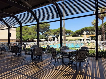 The luxury hotel boasts a seasonal outdoor pool and a dedicated children's pool. Pool loungers complement the poolside restaurant and bar.