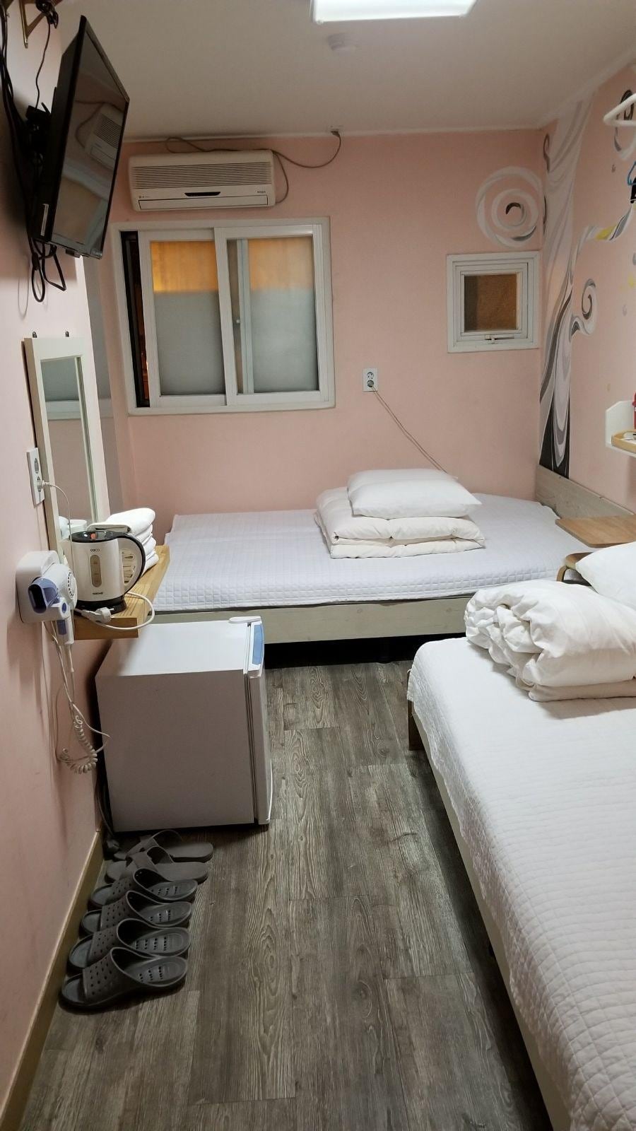 Guest house was in good location and right next to Seoul station. We did not expect much wih the room price paid. However, room was not clean with several dead mosquito bodies with blood stain on the bed sheet. Well, the old man sitting in the reception was a kind man and wanted to help the guest.